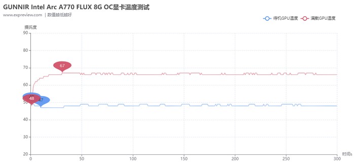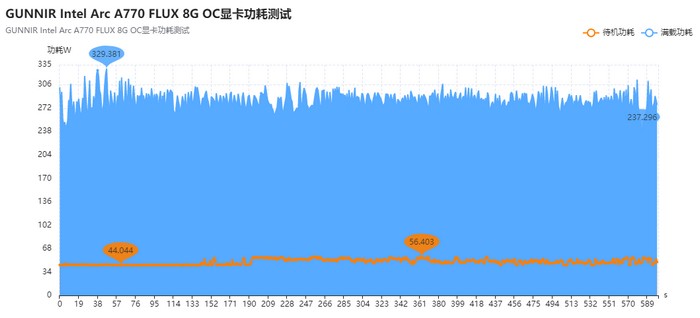 用 NVIDIA PCAT 工具测试,A770 平均功耗为 283.5W。不过,峰值功耗高达 329W。然而,更令人担忧的是48.7W的待机功耗摸着比许多N/A卡待机功耗要高不少。这个问题也被许多同仁测试确认,英特尔需要赶紧优化待机功耗。