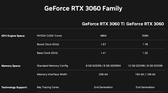 规格方面,核心不变,加速频率也一样,各自对比老款唯一区别是显存,RTX 3060的显存从12GB降级至8GB,而且位宽从192bit变成了128bit;而RTX 3060 Ti 显存则从14 Gbps GDDR6 升级至19Gbps GDDR6X 显存。