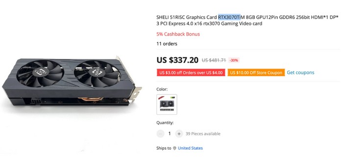 外媒 VideoCardz 在某线上平台上发现了一张很奇怪的显卡,型号是 RTX 3070 TIM ,属于桌面显卡,但后缀多了个“M”,深入研究才发现,这货居然用的是移动端 RTX 3070 Ti 的核心,卖337.20 美元(约 2445 元),倒是不贵。