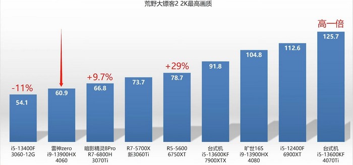 在游戏中,刺客信条或古墓丽影的性能高于台式机 RTX 3060 12GB,在2K(1440p)分辨率下,地平线5游戏中,RTX 4060 居然超过了 RTX 3070 Ti 的游戏本帧率,即使是赛博朋克2077也只有不到1帧的差距。不过在荒野大镖客中的差距稍大,达到了差不多6帧。