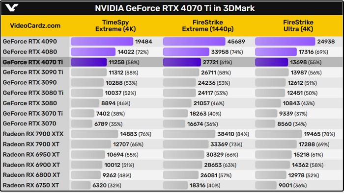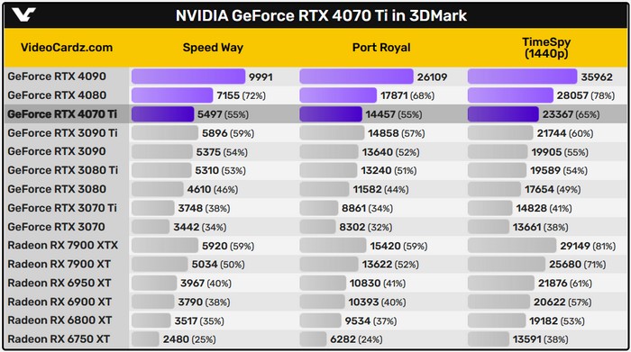 如图,RTX 4070 Ti 在 3DMark 测试中比 RTX 4080 慢20%至30%左右,比其前身 RTX 3070 Ti 快32%至39%左右,小胜 RTX 3090 Ti 。