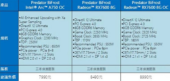 据台媒 Xfastest 最新消息,宏碁即将发布了三款非公版显卡,有 Arc A750 Predator BiFrost锐炫,还有 RX 7600 Predator BiFrost非公版,都属于“掠夺者”家族,目前外观渲染图、核心配置、甚至是价格均已曝光。