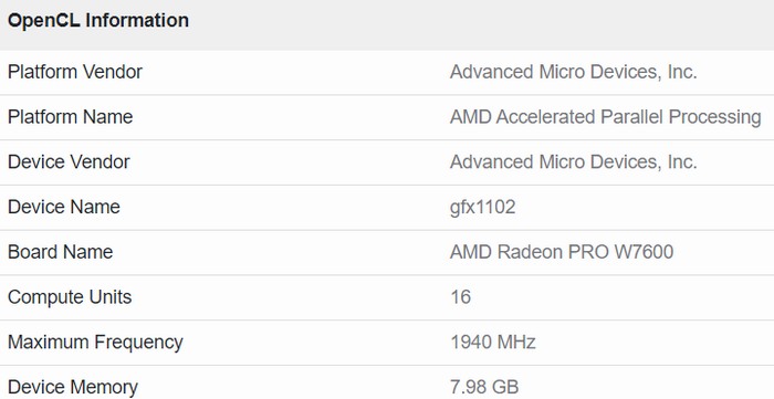 在 Geekbench 数据库中,一款入门级工作站搭载了ID 为 GFX1102 的新卡,显示型号是Pro W7600,该卡目前还没有发布。值得一提的是,这个内部代号和移动版 RX 7700 和 RX 7600 一样,这意味着该卡也基于Navi 33 核心。