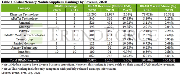 第一还是金士顿,总营收高达132亿美元,同比增长2%,表现相对平常。但市场份额依旧傲视群雄,达到了78.2%,几乎是Bug级的存在。不过,去年的市场份额较2019年降了约3%,这部分目前还不好说是被谁吃掉的。
