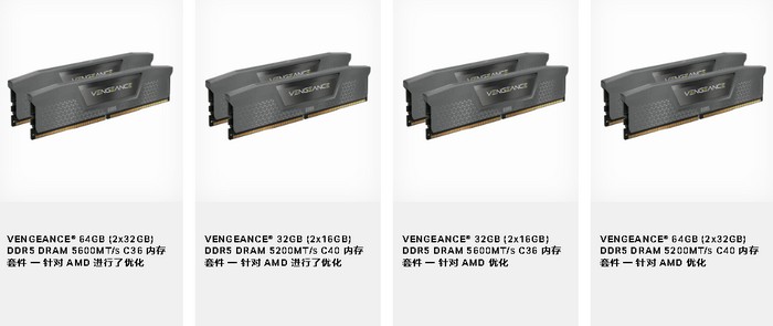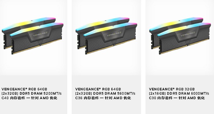 “复仇者”系列有不带背光的标准版和带RGB灯效的VENGEANCE RGB DDR5 Memory for AMD,和之前版本也一样,就不展开细说了。