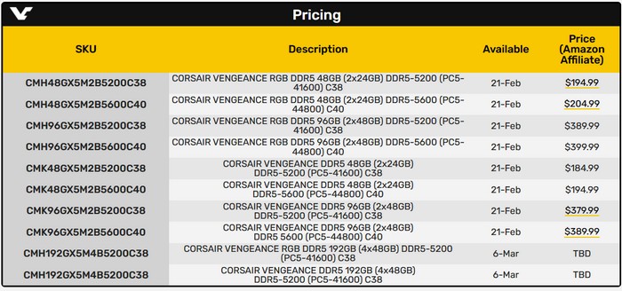 不过,今天美商海盗船发布了这种定制容量的内存,属于VENGEANCE复仇者家族,还有RGB版本可选。这次发布的有单条24GB/48GB以及48GB/96GB套装,工作站玩家们可关注。具体的规格如下: