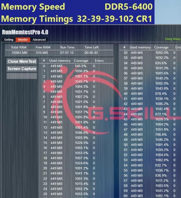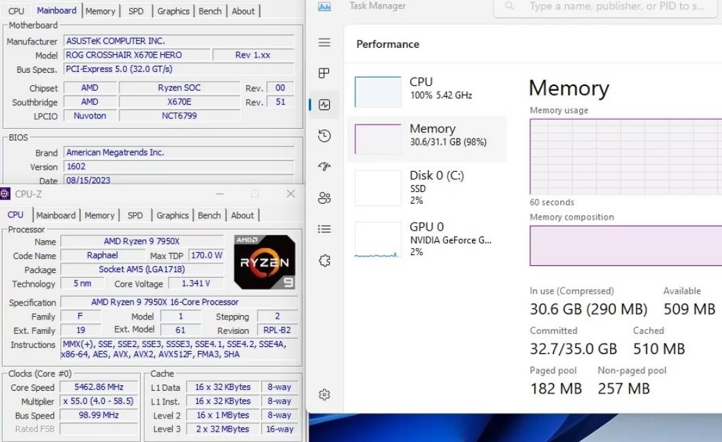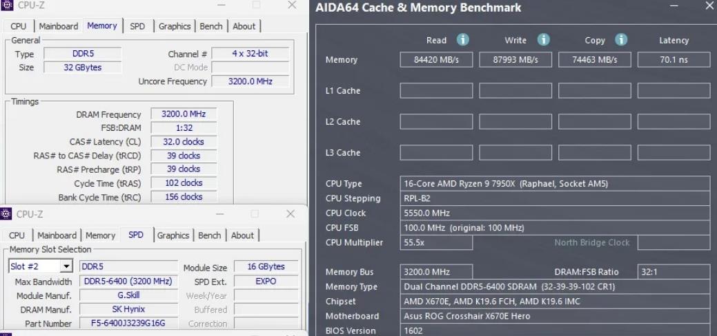 专为AMD锐龙平台优化,支持AMD EXPO 超频技术,下面是相关平台下的测试:CPU 用的是Ryzen 9 7950X,主板是华硕玩家国度ROG CROSSHAIR X670E HERO,更新了 1602 BIOS ,实测芝奇 DDR5-6400 CL32-39-39 32GB (16GBx2) 套条:
