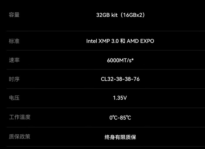 规格方面,精选采用海力士 A-die 颗粒,最高可选 DDR5-6000 规格,时序为 CL32,电压1.35V。