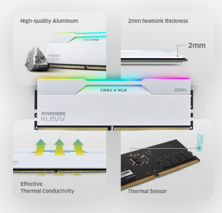 海力士旗下游戏品牌科赋(KLEVV),日前发布了新款 CRAS V RGB 系列内存,有 DDR5-8200 / 8400 MHz 以及黑(obsidian Black)/ 白( Brilliant White)两款,都针对高玩。