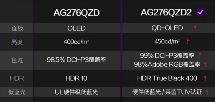 面板在面板上,采用QD-OLED 面板,之前是OLED 面板,典型亮度从400尼特升至450尼特,不过峰值亮度不变还是1000尼特;色彩也更好,原生10bit 色深,拥有 99% P3 和 98% Adobe RGB 色域覆盖,并符合 HDR TB400 臻黑认证,而之前是8抖色深,传统HD400认证。此外,新款通过了德国莱茵护眼认证。