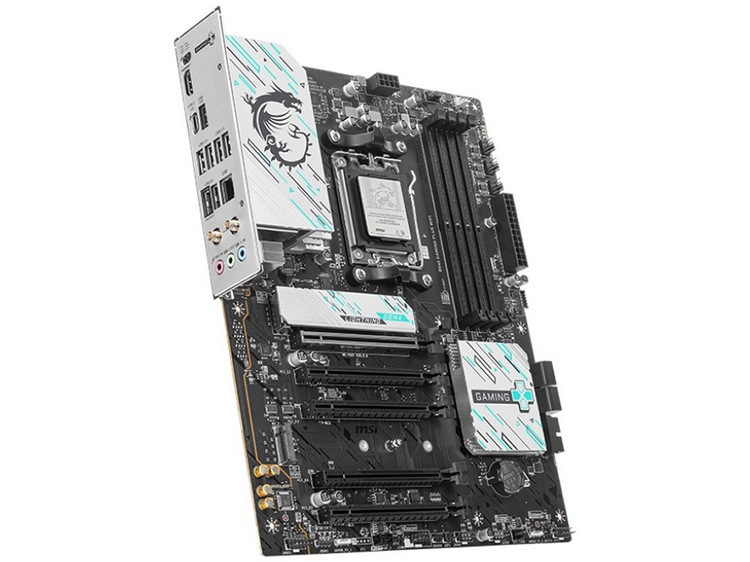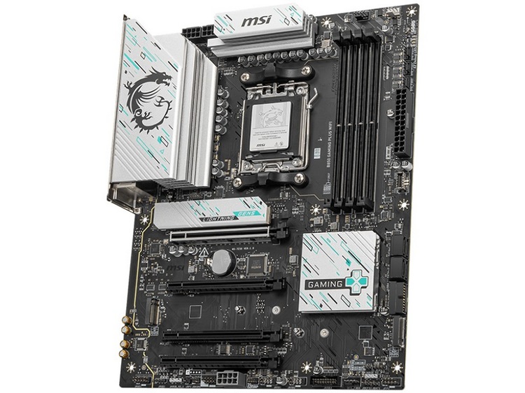 定位稍高的微星 MPG B850 EDGE TI WIFI 颜值高了许多,大量银白色覆盖件和散热片,还有 RGB 灯效点缀。