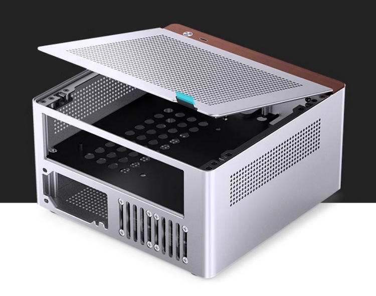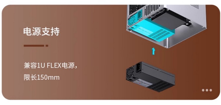值得一提的是,这款机箱还是双舱结构,电源和显卡都被安排在另一侧,能扩展 1U FLEX 电源和刀卡,需要注意兼容性,最高支持19cm长双槽刀卡。