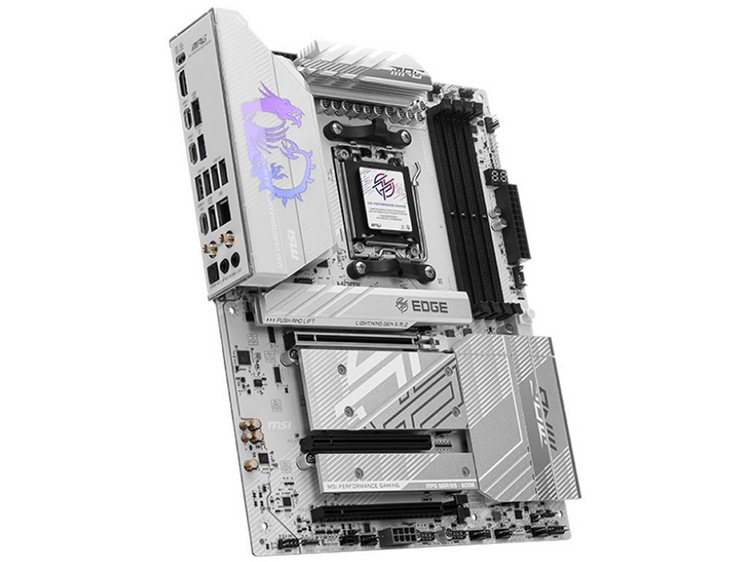 定位稍高的微星 MPG B850 EDGE TI WIFI 颜值高了许多,大量银白色覆盖件和散热片,还有 RGB 灯效点缀。