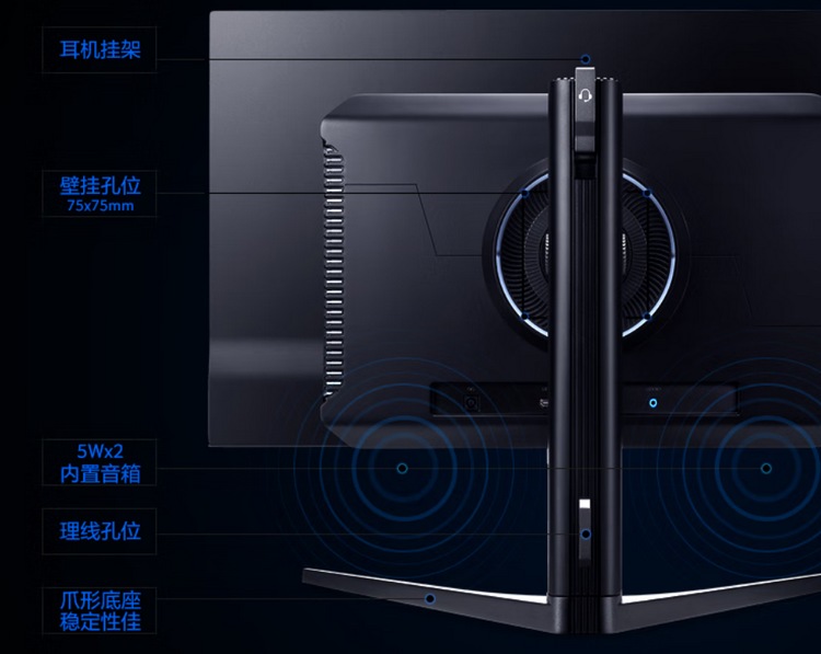 外观方面,屏幕窄边框,背后和支架设计还不错,比较战斗。它配多向可调节“Y”型支架,允许12cm升降、左右水平旋转和俯仰角调节,可惜不支持垂直旋转。当然,也支持 VESA 75mm 壁挂,支架上还留有束线孔和耳机挂架。