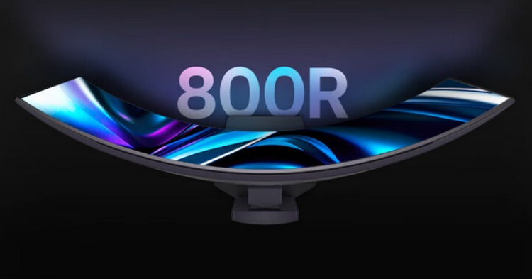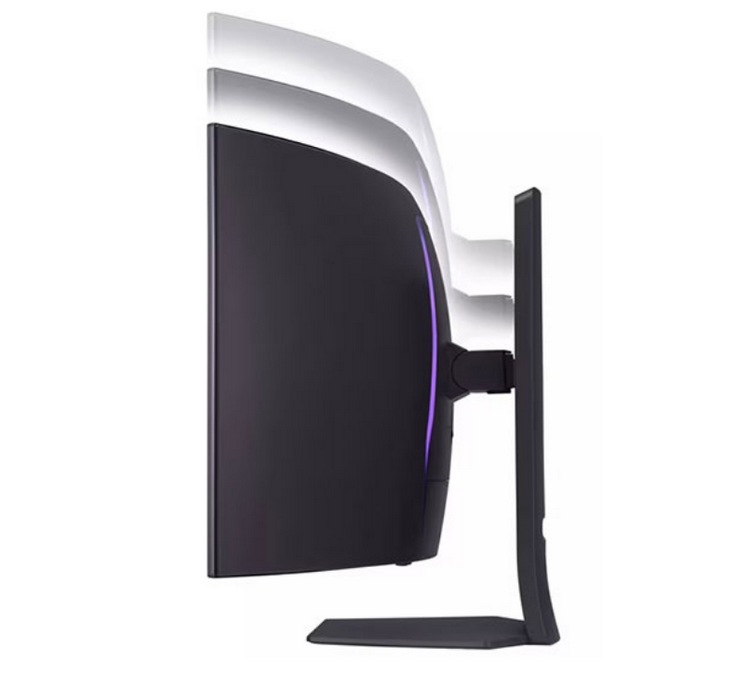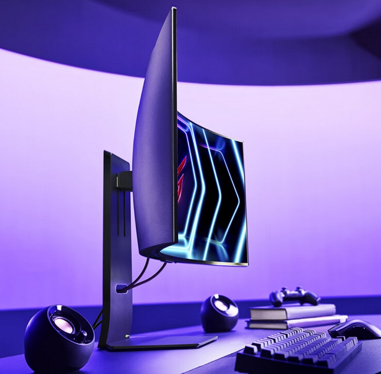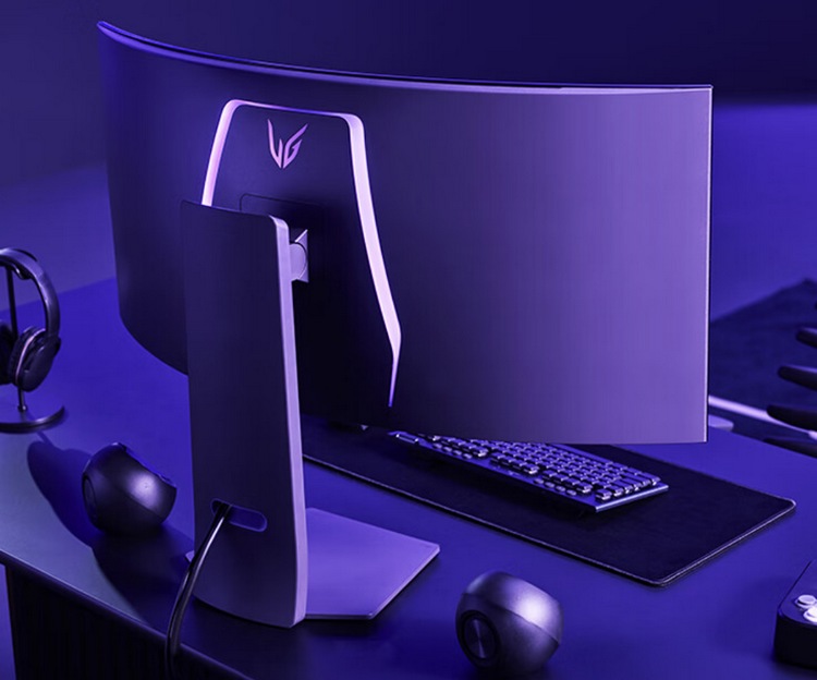 外观设计模具不变,还是宽大的L型支架,背后带有 RGB灯效,高曲率曲面屏,屏幕四边窄边框,支架可以多向调节。
