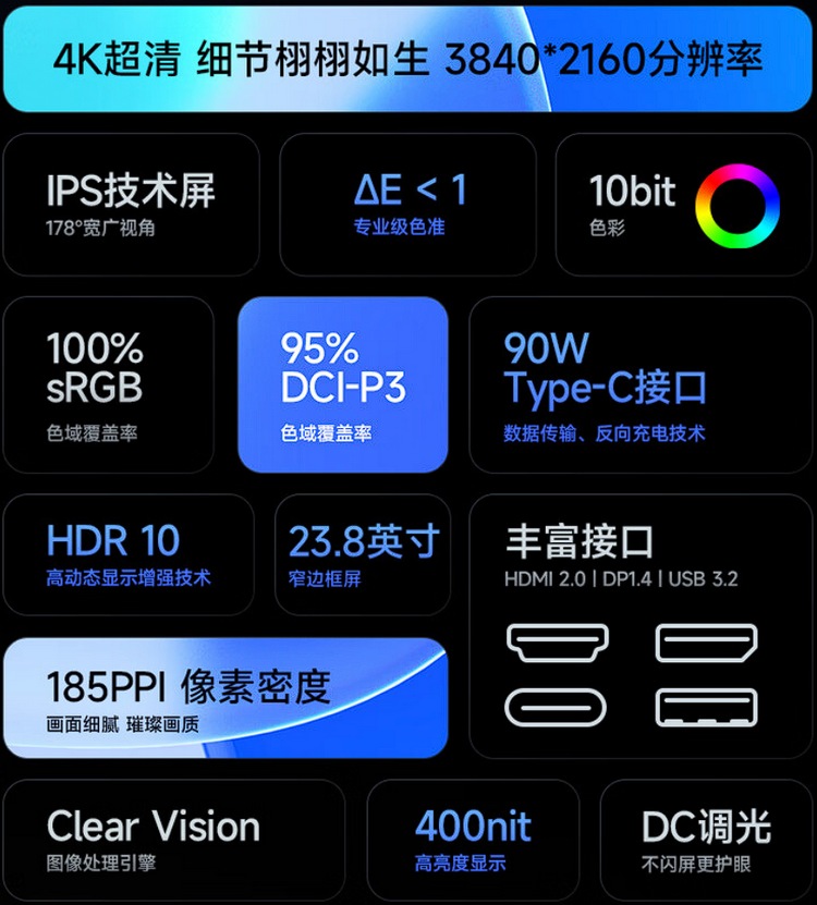 规格方面,基于23.8英寸 IPS 面板,16:9 长宽比,提供3840 x 2160 分辨率,400尼特亮度,1300:1 静态对比度,10.7亿色显,色深10-Bit ,色差没说,覆盖 100% sRGB 及 95% DCI-P3 色域。