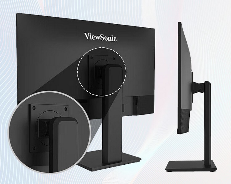 外观规整,背后简约,支架宽大,支持多向调节,也支持 VESA 100mm 壁挂。