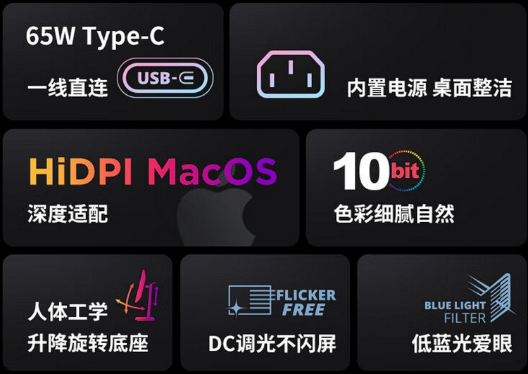 扩展包括:双HDMI 2.0、DP 1.4、全功能 USB-C(65W PD)和音频接口等。值得一提的是,它还深度适配 MacOS ,兼容性好,色彩一致性好。