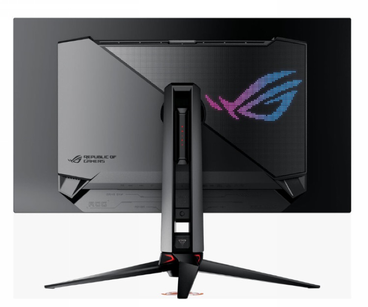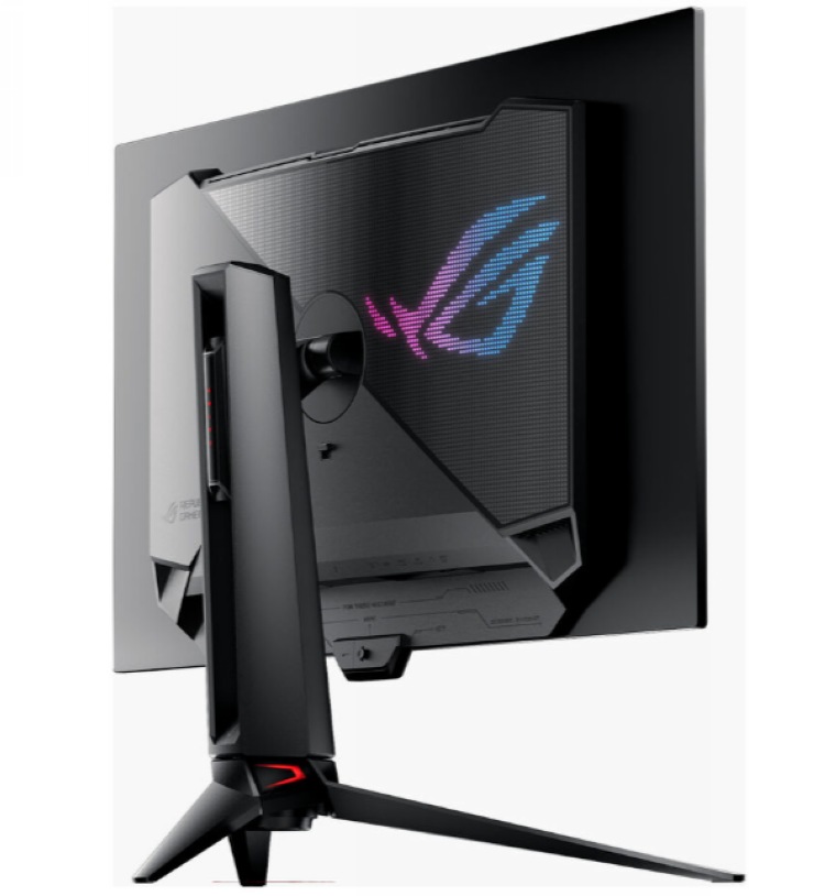 外观战斗,配鹰爪支架,带桌面射灯,屏幕四边窄边框,支架支持多向调节,背后还有醒目ROG 像素点 RGB 灯效。