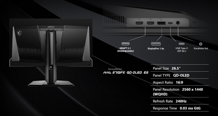 规格方面,基于26.5英寸 QD-OLED 面板,16:9 长宽比,2560 x 1440 分辨率,峰值1000尼特亮度,符合 DisplayHDR True Black 400 认证。