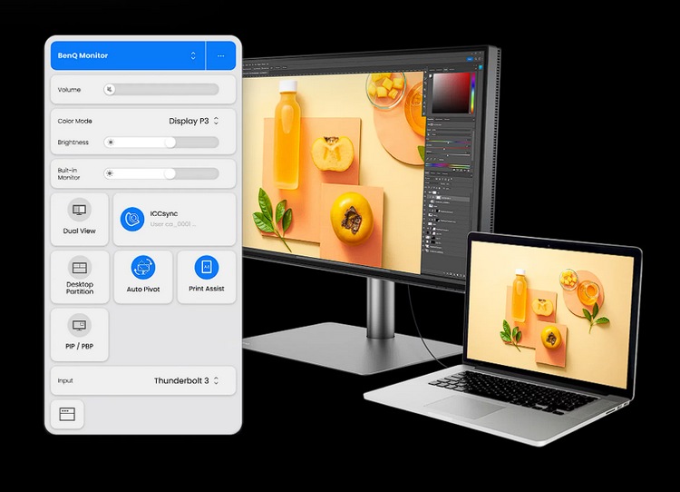 此外,具有 KVM 切换器功能,自带外接控制,同时还支持 Display Pilot 2 软件,轻松管理打印、自动旋转、画中画PIP/PBD、ICCSync、亮度调节等。