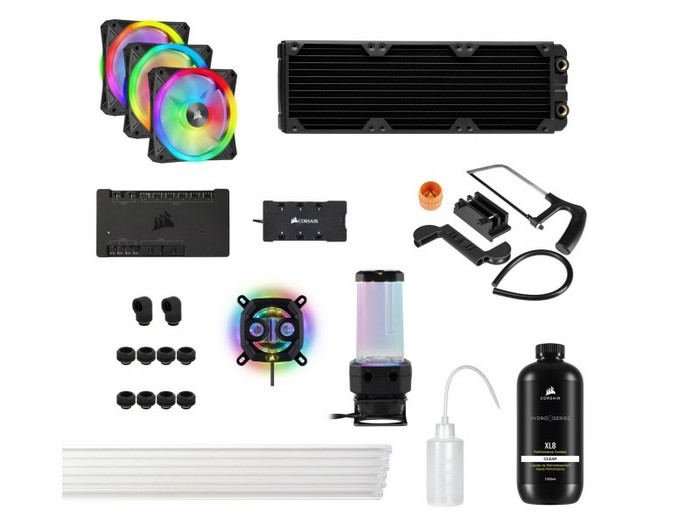 定位稍高的iCUE XH305i RGB PRO采用的是自家的“XC7 RGB PRO”水冷头,还有集成水泵和水箱的“XD5 RGB”,冷排是“XR5 360mm”,还有风扇控制起以及拥有可寻址RGB 灯效的iCUE QL120 RGB PWM风扇。