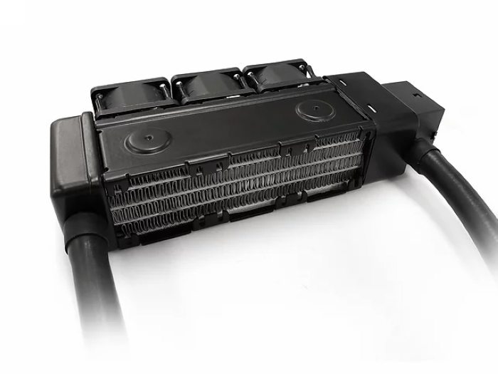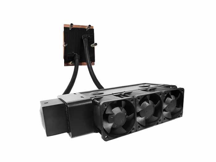 这款水冷专为IU服务器打造的,由于IU机箱很薄,所以它配有厚度为40mm的小型水冷排,侧吹方式,配有3把40mm直径的暴力风扇,转速7000-15000rpm ± 10%,最低风量12.56CFM ,风噪 42.26dBA ,风压7.80mmH2O ,最高噪音58.81dBA,风量26.91CFM,静风压35.80mmH2O,官方宣称可压制处理器320W时的热量。
