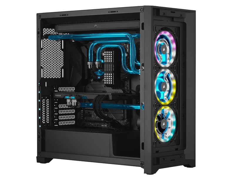 这是“Hydro X”系列的新型水箱+泵一体式方案,长的很像带风扇的360mm水冷排,其实它并没有风扇,但带了三圈儿ARGB LED可寻址灯条,支持海盗船iCUE背光生态,可以自定义灯效,或设置同步背光。