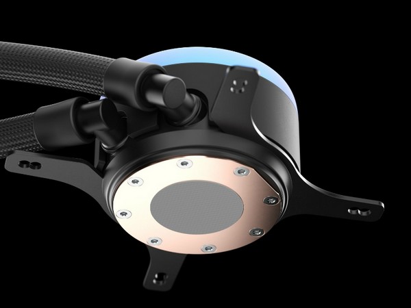 这个系列定位主流级,强调性价比,水冷头的设计还算亮点,半透明雾化的顶盖内集成可寻址RGB灯珠,内有渐变虚幻的灯效。另外,顶盖可以垂直旋转90°,任何角度装机都能调整到更佳位置。