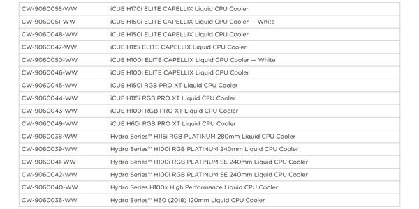 新扣具可用于海盗船ELITE CAPELLIX系列、RGB PRO XT系列、H100x等散热器上,具体兼容的型号包括如下: