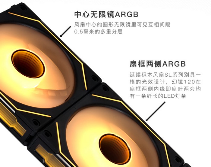联力也推出了新风扇,不过趋向不同,主打颜值、有全新更绚丽的RGB灯效,它就是第三代积木风扇——UNI FAN SL INFINITY 120“幻镜120”。