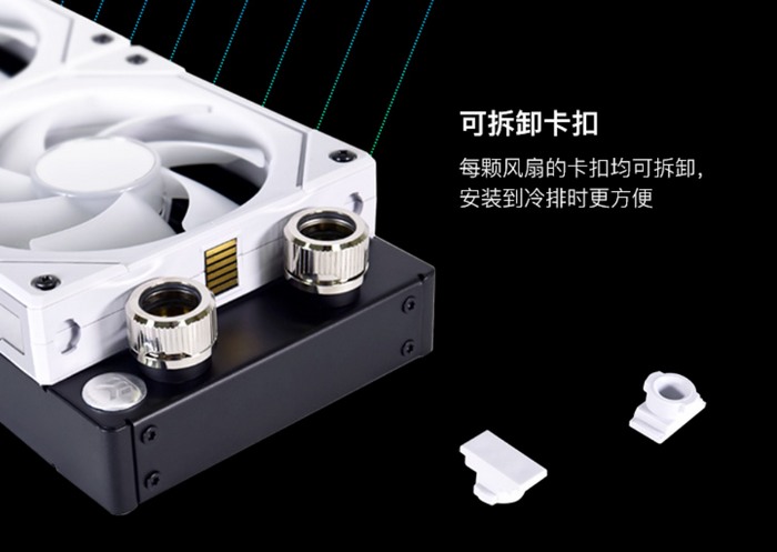 其他不变,沿用积木系列风扇快速拼接方案,不过这回侧面的卡扣可以拆下来,因此可以装在其他单体风扇设备或水冷上,一点也不突兀、不干涉。