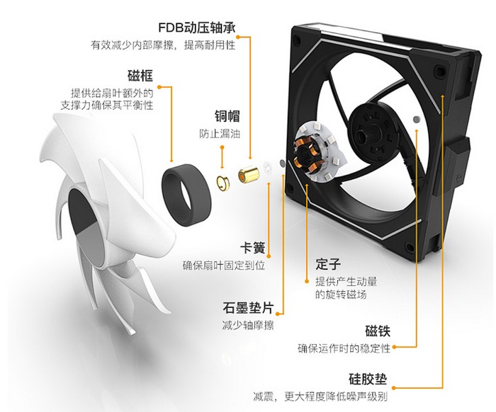 采用FDB液压轴承,有石墨垫片、框架中有磁铁强化固定性,同时四角有缓震脚垫,进一步降低共振噪音。