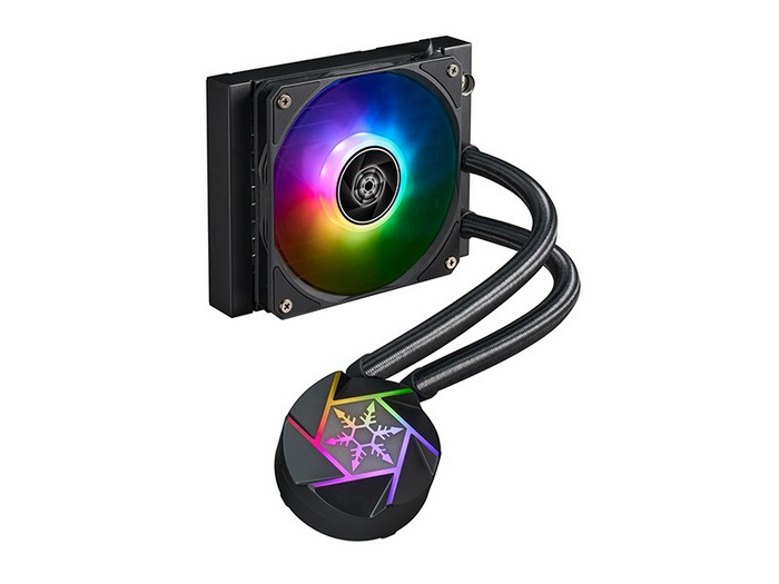 水冷头很有设计感,旋转式造型,中间有个醒目的银欣雪花LOGO,支持RGB背光,仅41mm厚,纯铜底座,内集成三相电机,转速为4200±10% rpm。另外,水冷头顶盖可旋转调节方向。