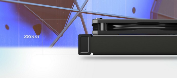 自带120mm水冷排,只有22mm厚度,风扇也只有16mm厚,因此水冷排这块仅38mm厚,而传统的水冷厚27mm+25mm=52mm。所以,这种方案对空间有限的紧凑平台很友好。