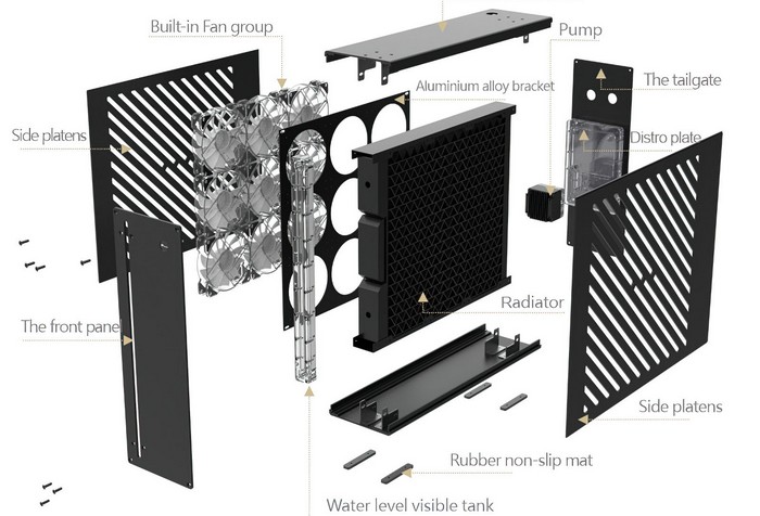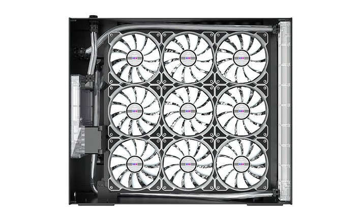 这款 Bykski B-1080-CEC-X 水冷个头相当大,比许多游戏主机要大很多,因为内有个正方形的超大水冷排,一共有9把风扇。尺寸为42×48×14厘米,如果能塞入全塔中,配合个ITX小主板也不是问题。