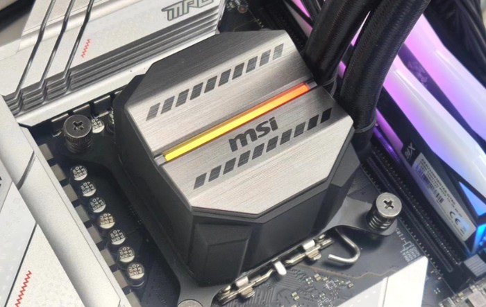 冷头的设计有辨识度,保留军火库家族标志设计,配有硬派拉丝铝制面板,中间有一条RGB灯条,支持背光同步灯效。虽然比微星 “寒冰” 系列灯效要逊色不少,但这也符合“军火库”系列低调,强调用料、硬派设计的风格。