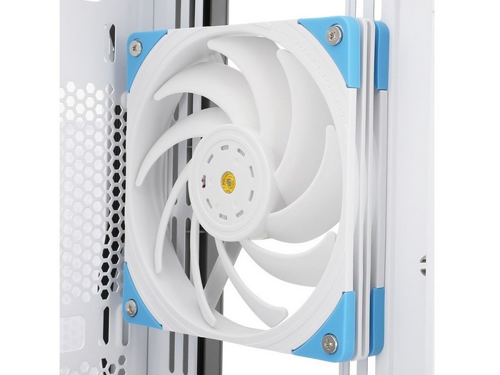 依旧是白色涂装,扇叶和框架都是白色的,四角默认是白色缓震胶垫,但还额外附赠了蓝色的胶垫,配色清新,很适合白色主题的散热器、机箱选择。