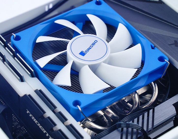 设计尺寸都一样,103 mm x 92 mm x 40 mm,重量为 350g。配有四根6mm直径热管,鳍片数量更多了,但没有说增加了几片。风扇还是15mm超薄的,90mm直径,蓝色框架、白色扇叶很特别,有点像银欣多年前的风扇。