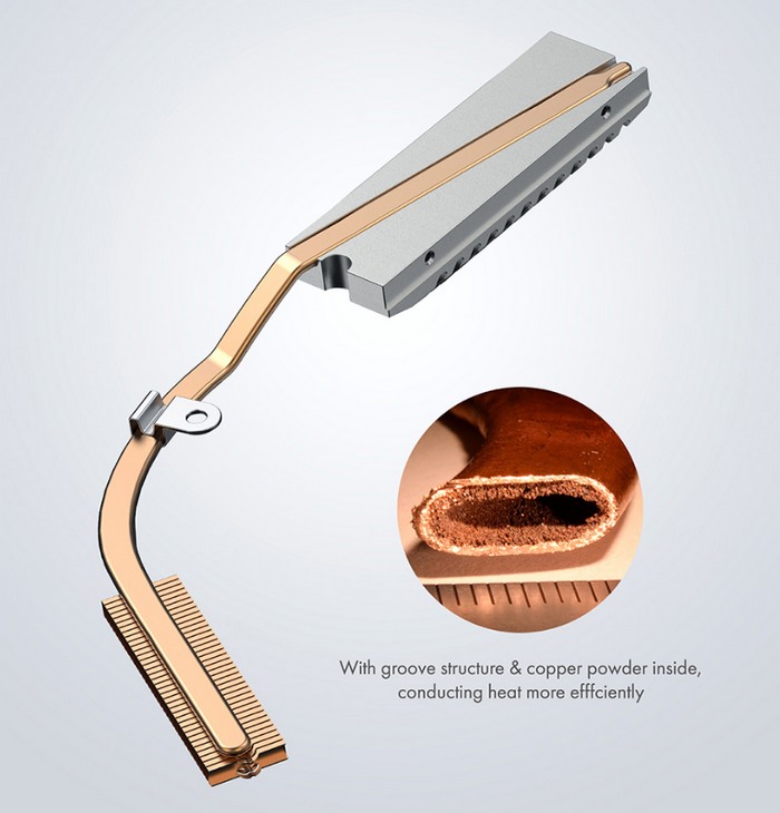 这是一个带热管(7mm宽)、还带纯铜散热鳍片的被动散热器,但可以利用机箱风扇主动散热,所以效果比之前见过的产品要好很多。官方表示,能降低50%的温度,大概降低15-25摄氏度。