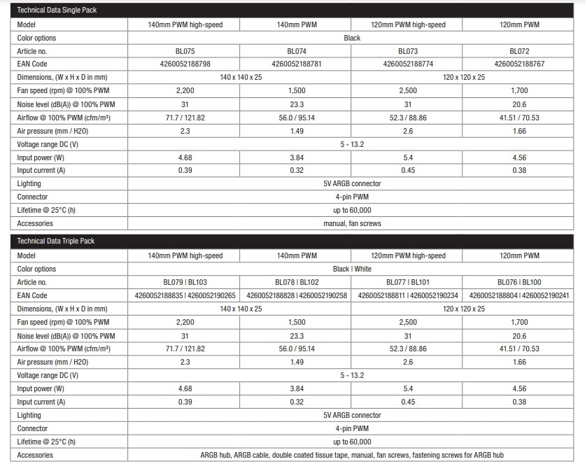 规格方面,都支持PWM,标准版120mm最高转速1700rpm,140mm最高1500rpm;高速版120mm的转速最高2500rpm,高速版140mm版本最高转速2200rpm,都承诺6万小时无故障运行寿命,风扇具体的风冷和噪音规格如下: