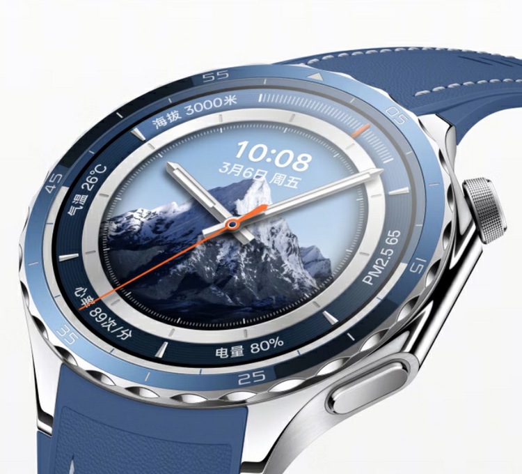 外观和用料升级,采用钛合金双色工艺表圈、蓝宝石水晶表镜(8级+莫氏硬度)、旋转表冠、以及1.5英寸 LTPO 超亮钻石屏,峰值亮度2200尼特,户外也清晰。
