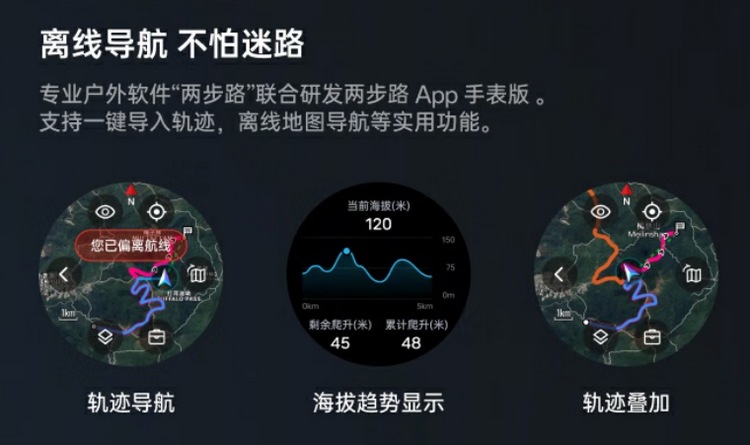 运动健康方面,支持心电图、心率、皮肤温度和血氧监测,支持多达100+种运动模式,包括11种专业模式,其中6种可以自动识别,并支持双频GPS定位,支持离线导航,还有跑姿分析功能。
