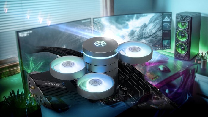 银欣 IceMyst 系列水冷头顶部最多可以堆8把风扇,这样就可以照顾到旁边的供电和内存以及M.2 SSD了。风扇直径7cm,带可寻址RGB灯效,可以背光同步。风扇的具体规格目前还未公布,应该不会太暴力,毕竟只是辅助散热,需考虑噪音和共振问题。