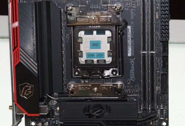 原理很简单,就是调整散热器底座与CPU顶盖的位置,大概向下移动了7mm左右(主板朝上摆放时),这样就能将散热器底座中间点与核心CCD正对,而之前底座正对着的是IOD芯片。