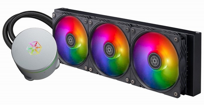 展会上曾看到,银欣 IceMyst 系列水冷头顶部最多可以堆8把风扇,风扇不大直径为7cm,带可寻址RGB灯效,可以背光同步。