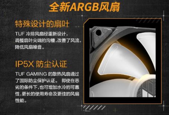 TUF Gaming LC II 360 ARGB “破冰手”配备 360mm 铝制水冷,由三把 120 毫米 ARGB 风扇压制,风扇扇叶优化,末端有沟槽,改善风压、同时降低噪音。另外,风扇符合IP5X防尘认证。