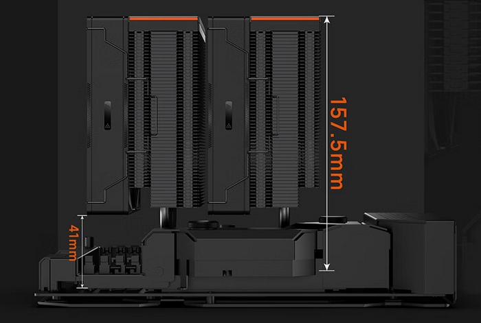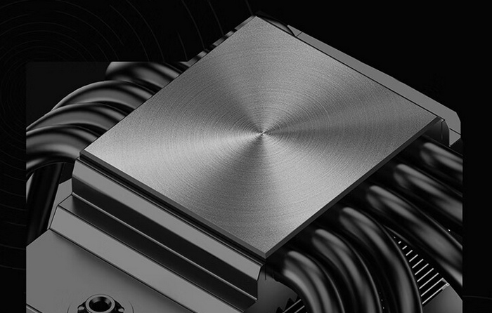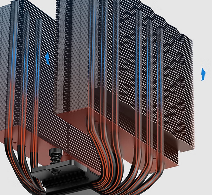 双塔结构,有6根6mm直径热管,抛光CD纹纯铜底座。值得一提的是,散热鳍片采用“三角波浪鳍片矩阵”,气动声学应用,减少风切声,同时提供高风压,提升散热鳍片散热效率。