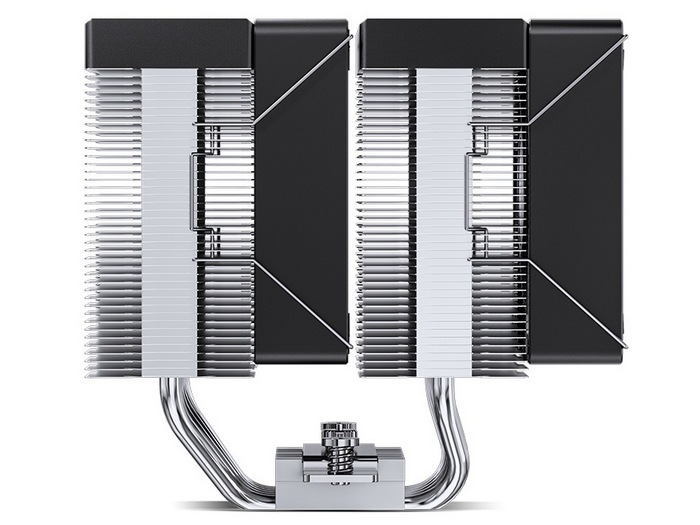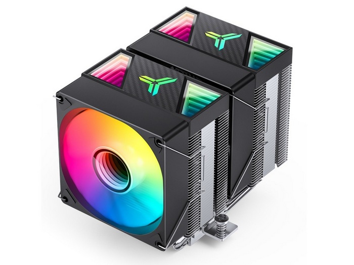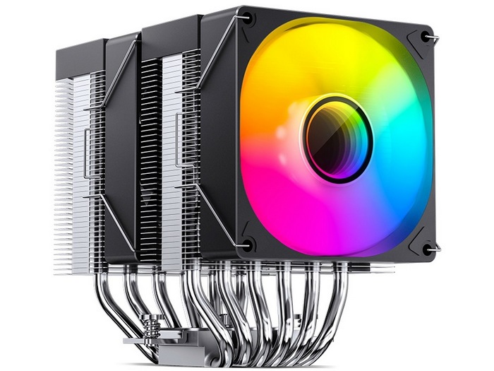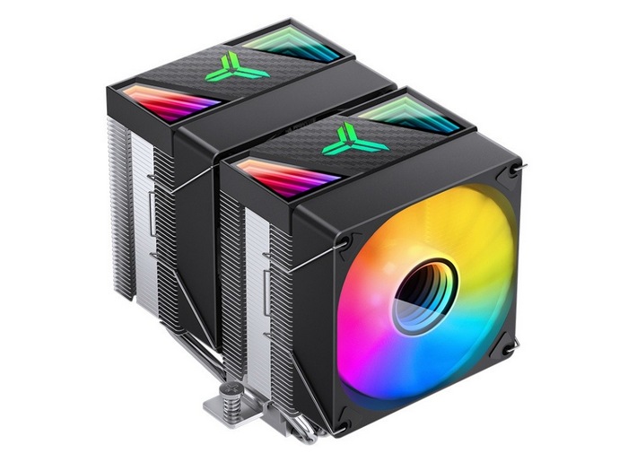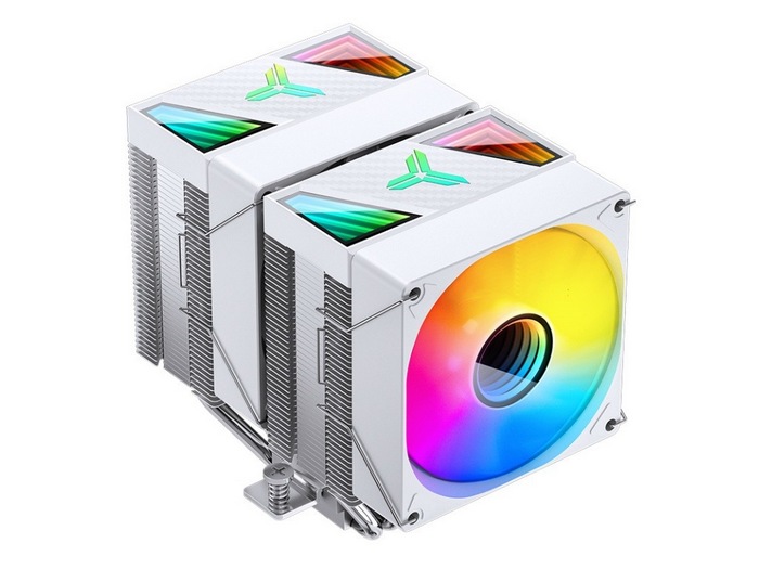 颜值颇高,风扇和顶部都有RGB灯效,提供黑和白两个版本。个头不大,属于小型双塔结构,机身尺寸为深144mm、宽92mm、高136mm,适合垂直空间有限,但想要更好散热的中高端玩家。