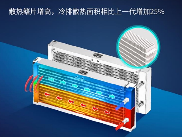 采用240mm低阻力冷排,流速更快,同时散热器鳍片增高,散热面积较上代增加25%,散热上限更高。